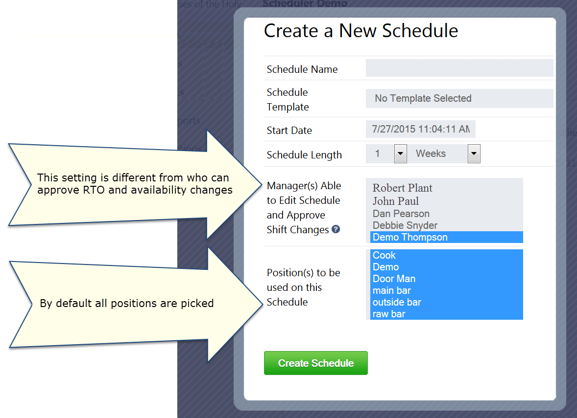 - Both settings below (managers who can approve pickups and positions used on schedule) can be updated by clicking the schedule settings link located within each schedule next to the green publish button