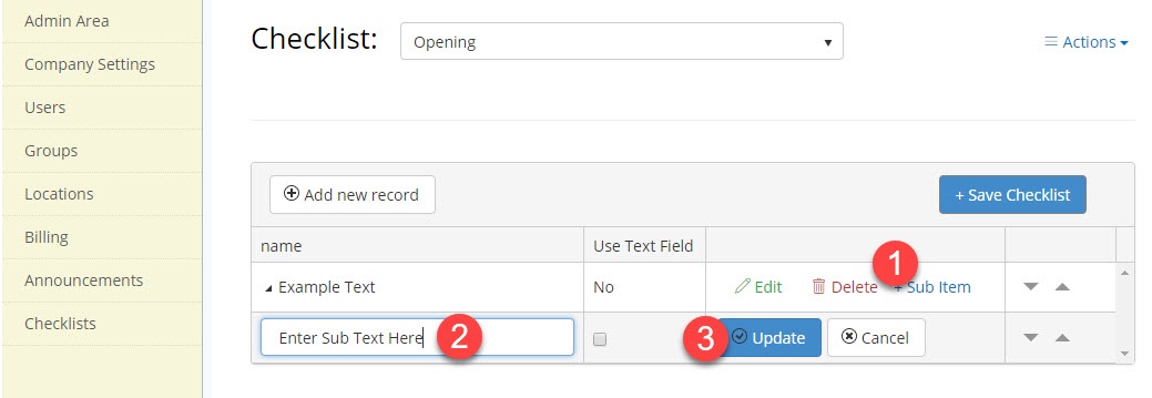 - Text Field (if checked allows you to add text to this item in the checklist)
