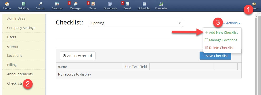 To access Checklist: Login to ShiftNote > Click Admin (right hand corner) > Click Checklist (yellow nav bar)