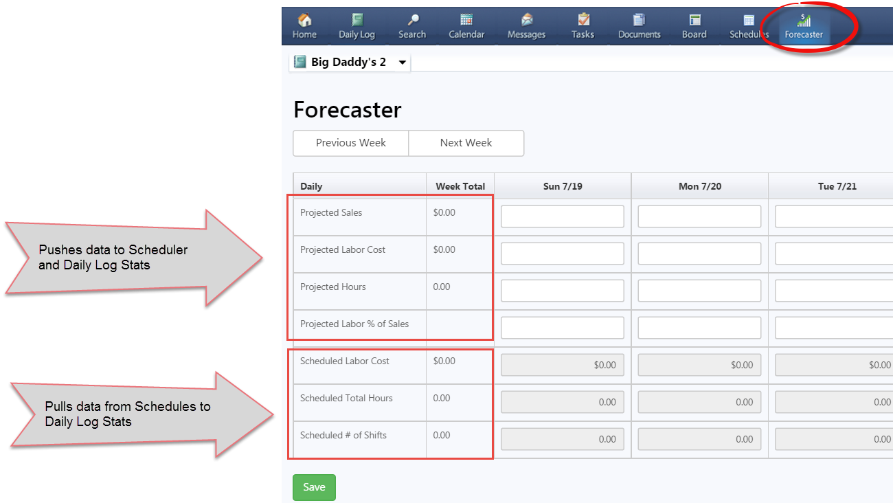 The Forecaster feature provides a place to add sales and labor budgets for future date(s) one week at a time.