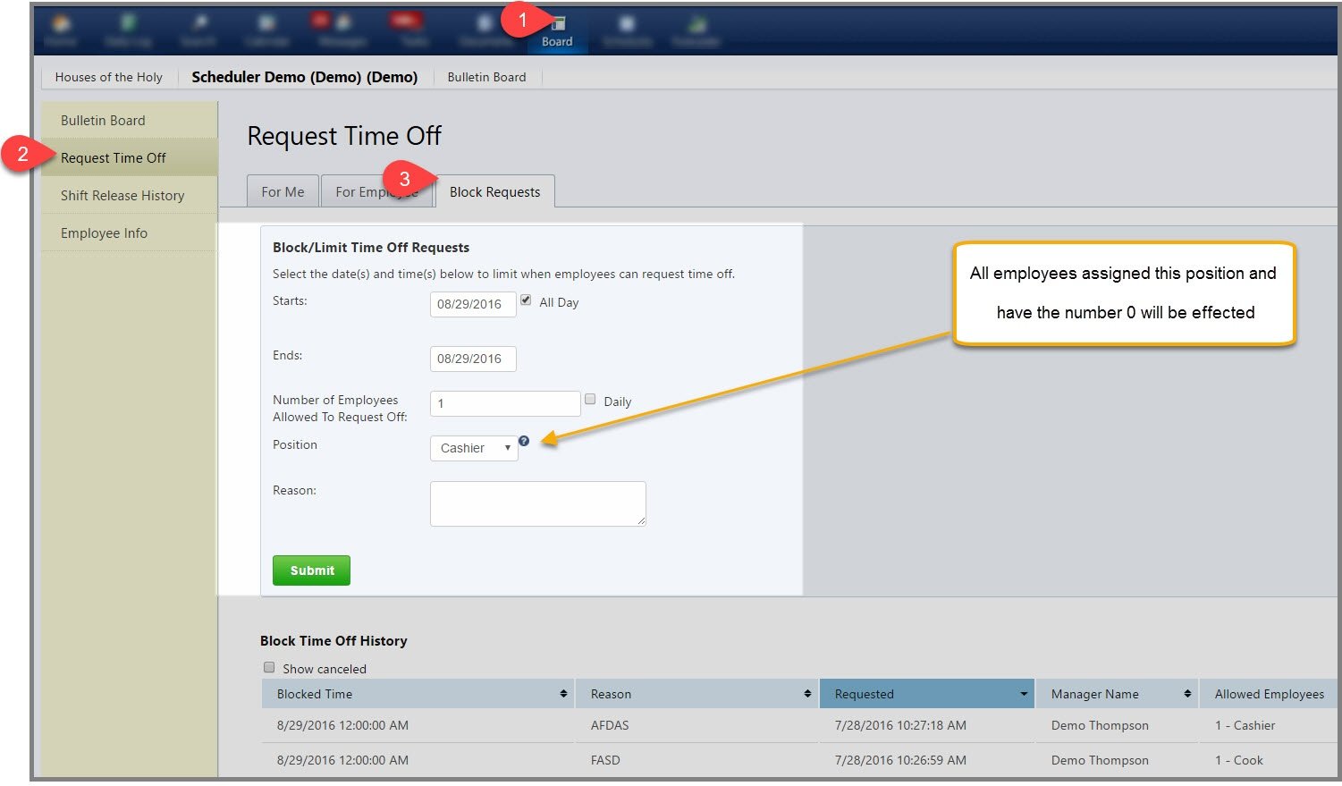 - Enter number of employees allowed to request off during set time period. Use the ‘daily’ check box to limit number of employees allowed off by day, or in total during set time period.